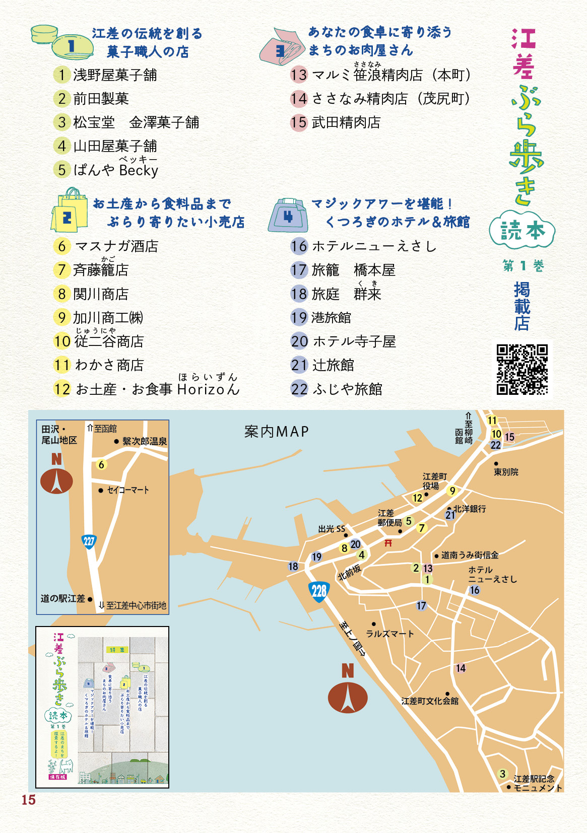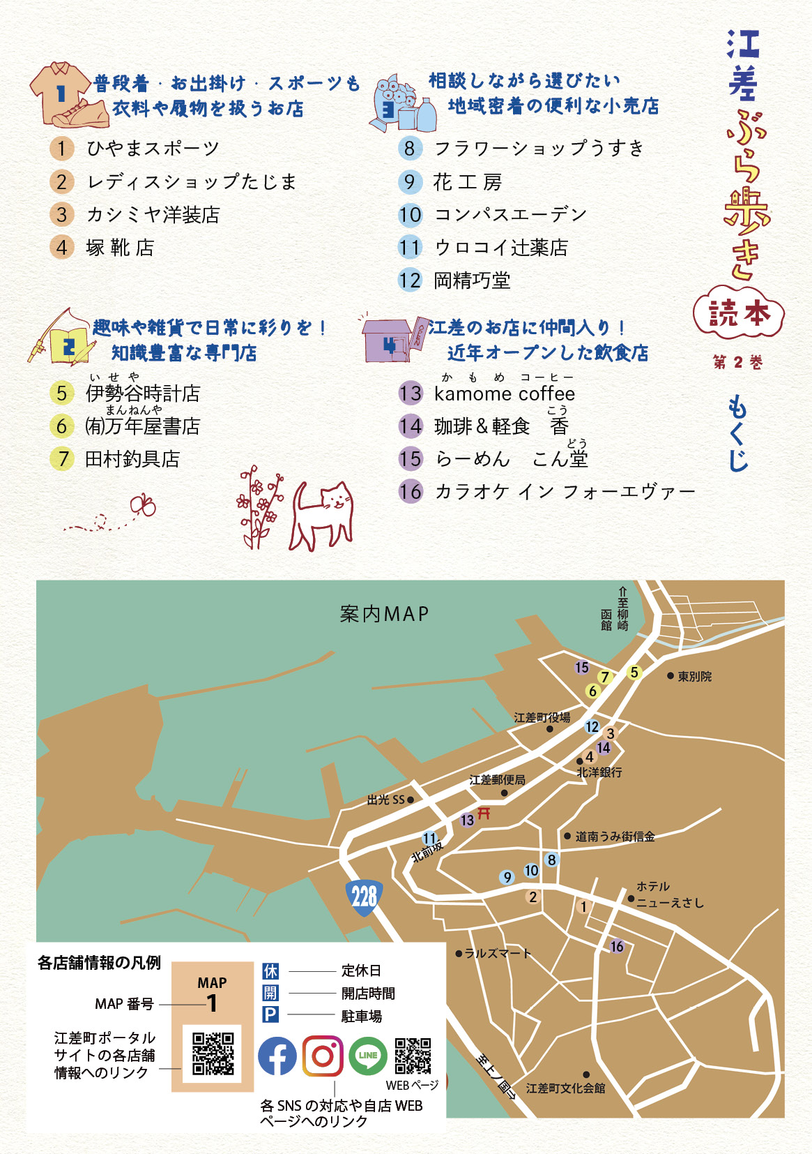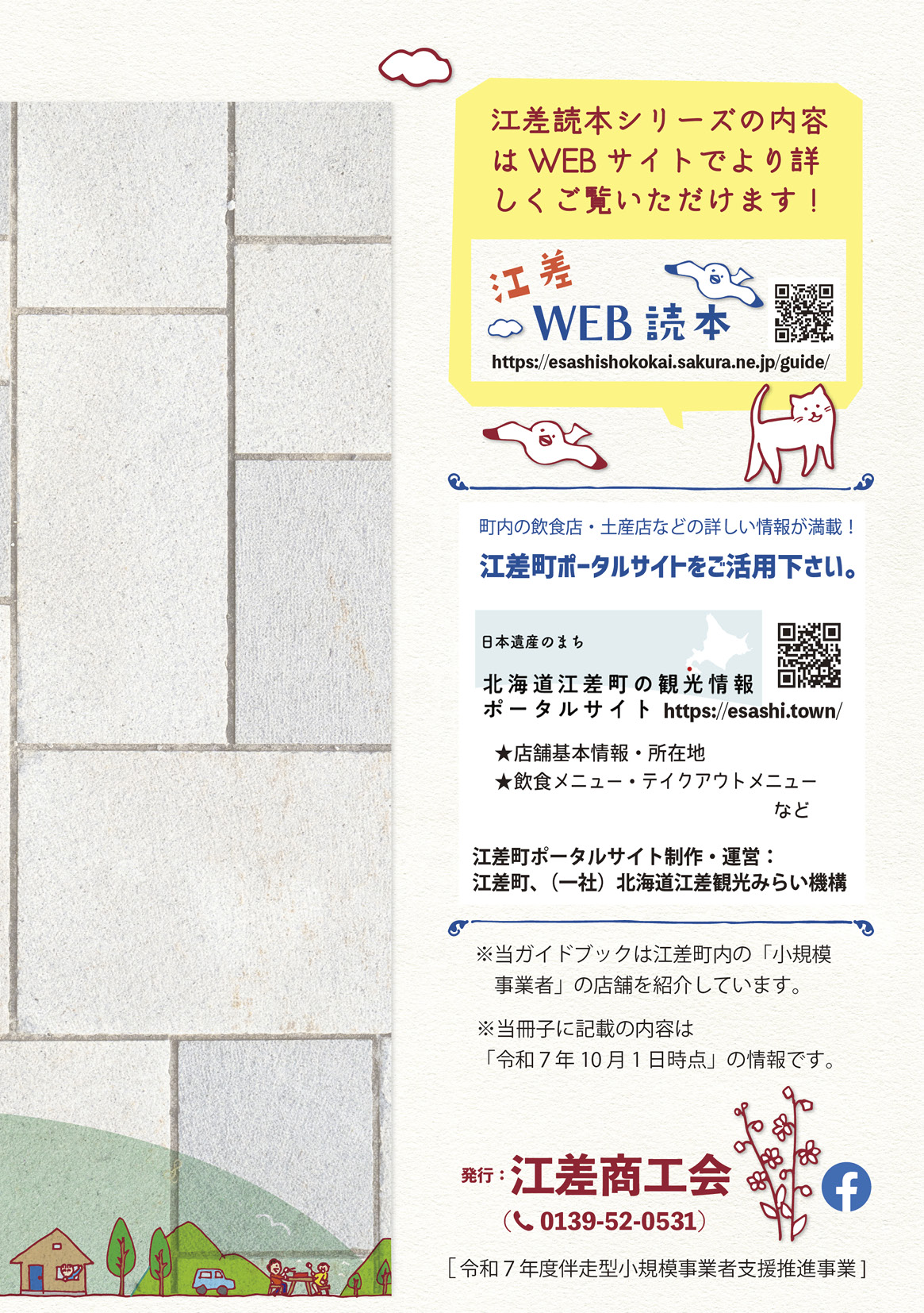 江差町のまち歩きの際に立ち寄っていただきたいお店や宿泊施設を紹介する情報誌「ぶら歩き」シリーズの第2弾です。新たにオープンした飲食店も掲載しています。ぜひお店選びの際にご活用下さい。