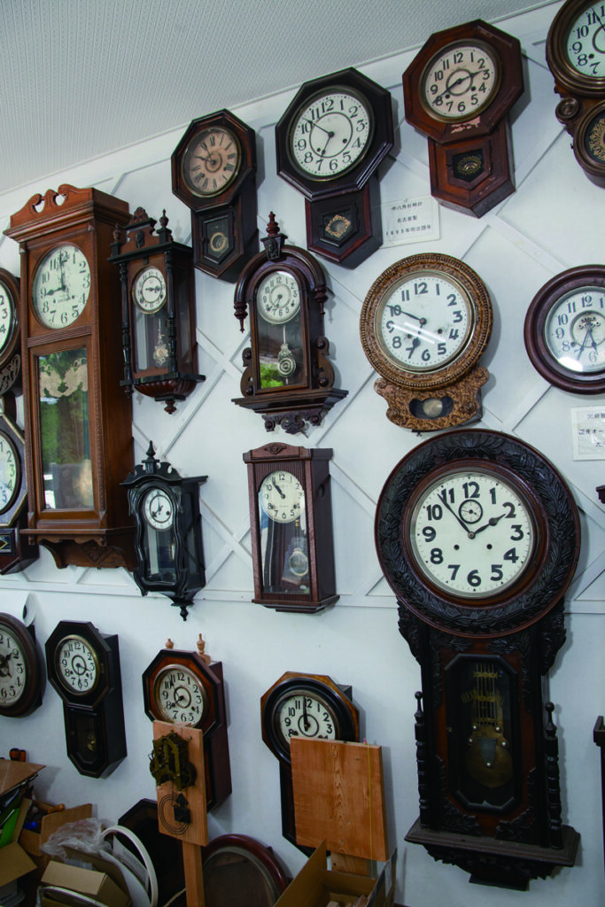 大正14年創業の老舗で、機械時計の修理技術を持つ今では希少な店です。三代目店主が先代より時計の販売と修理を引き継ぎ、店内には年代物の柱時計が多数展示されていて、長年に渡って時を刻み続けています。