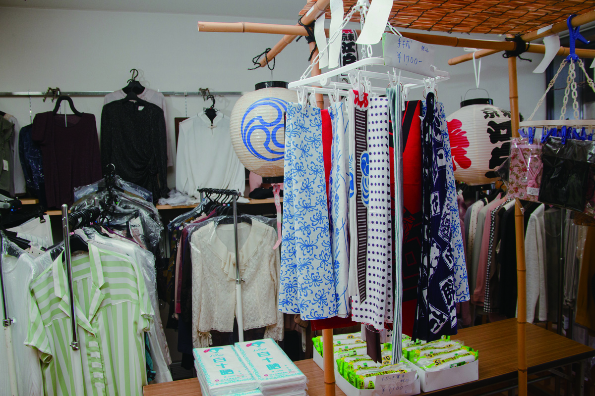 夏は店内の装飾がお祭り一色に。シャツ、小物、幕、提灯まで祭り用品がすべて揃う。